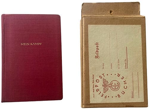 Adolf Hitler’s autobiography and political manifest. The copy that is offered for sale was published in 1941 by Central Publishing House of the NSDAP, Franz Eher, Nachf. in Munich, Germany. It was thought that not only the fellow Volksgenosse at home should read Mein Kampf but also the soldier who fought for their freedom at the frontlines. Therefore, a much smaller but unabridged copy was published. Its size was 4-1/2 x 6-3/4 inch, so it could be carried easier by the soldier than the standard edition. It was also printed on much thinner paper. It would be interesting to know how many soldiers actually read this book in their foxhole, trench or wherever else they saw duty. The copy offered here is in very nice condition and comes with the rarely seen undamaged original box in which the book was intended to be shipped to the front line as a field post package. The box even still has the pin with which the box was kept closed.