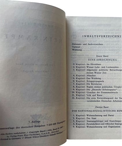 Hitler dictated this book to his secretary, Rudolf Hess while imprisoned in Landsberg after the failed 1923 revolution. The first editions (1925 and 1926) were only “Band I” (volume one), “Band II” (volume two) was first published in December 1926! All the “official” Third Reich copies (1933 to 1945) contained both volumes combined in one book. Very few copies of the first editions have survived. When his book first came out it was not a success, few people cared about the book in 1925 which would almost have had a much longer title. The original title Hitler chose was “Viereinhalb Jahre [des Kampfes] gegen Lüge, Dummheit und Feigheit” (Four and a Half Years [of Struggle] against Lies, Stupidity and Cowardice). His Nazi publisher, Max Amann, decided this title was too complicated and had it shortened to Mein Kampf (simply “My Struggle”). Before Hitler became Reich Chancellor of Germany in 1933, Mein Kampf sold very slowly; but in 1933 alone 1.5 million copies were sold.