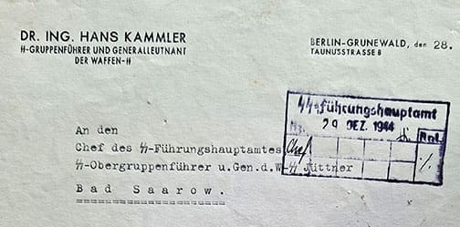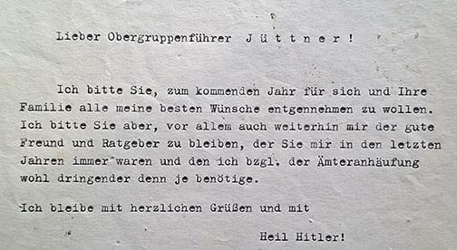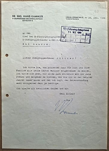 The document, dated 28 December 1944 and signed in ink by SS-Gruppenführer und Generalleutnant der Waffen-SS Hans Kammler is addressed to the head of the SS-Führungshauptamt SS-Obergruppenführer und General der Waffen-SS Jüttner. In the letter Kammler wishes Jüttner all the best for the upcoming New Year and thanks him for all the professional help and advice he received from him over the years.