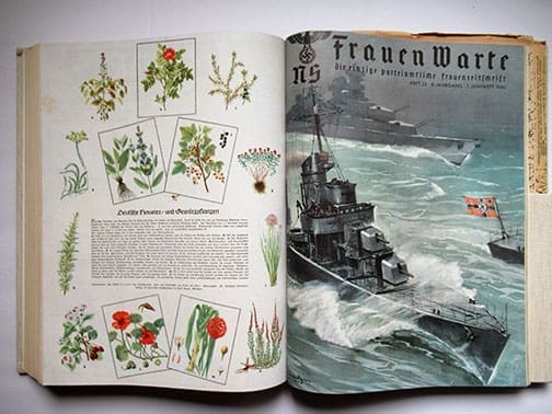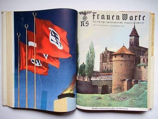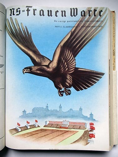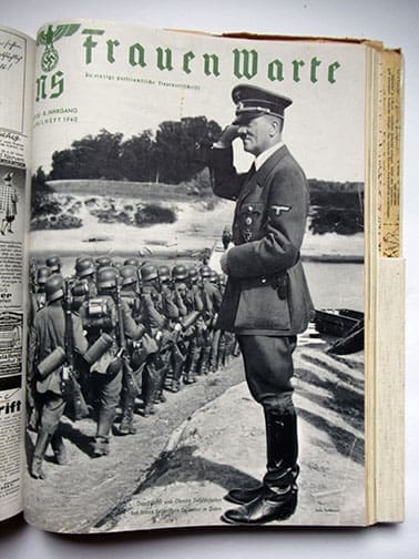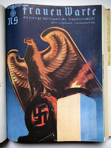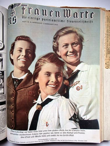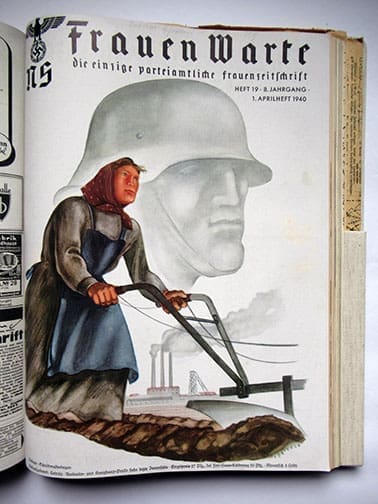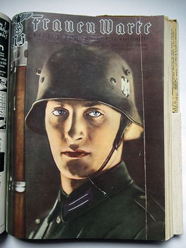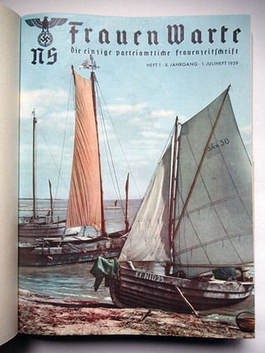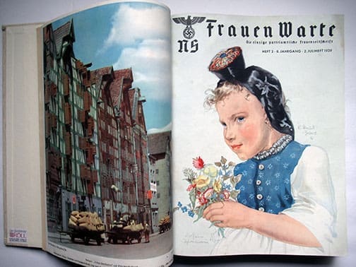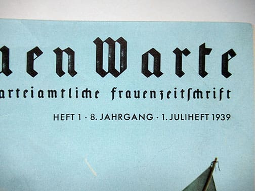 The NS-Frauenschaft (NSF) was founded in October 1931 as a union of several national and national socialist women’s associations. After the NSDAP came to power in 1933 the NSF was declared the sole parteiamtliche Frauenorganisation (official Nazi Party’s Women’s Association). The NSF was the core of the Deutsches Frauenwerk (DFW) which regulated the life of German women in the Third Reich. From February 1934 to the collapse of the Third Reich the NSF’s leader was Reichsfrauenführerin Gertrud Scholtz-Klink (1902 – 1999) who was also head of the DFW. She was an NSDAP member since 1930, her third husband was SS-Obergruppenführer August Heissmeyer and together they had eleven children (only the last one she had together with Heissmeyer). In order to fulfill their tasks regarding educating and leading the German women in the national socialist way the NS-Frauenschaft became an official NSDAP sub-organization in March 1935. The NSF was then structured identical to the Nazi party, divided into Gau, Kreis, Ortsgruppe, Zelle, Block and Haushaltungsgruppe. New members had to prove their political qualification in order to be accepted, i.e. they had to be members of the Bund Deutscher Mädel (BDM or League of German Girls) or other Nazi organizations. About 2.3 million German women were organized in the NSF. At least once a month they had to attend the so called “Frauenschaftsabend”, a weekly scheduled political meeting similar to the ones held in the Hitler Youth and BDM. In these meetings the women were lectured about the national socialist ideology, racial questions and their role as wife and mother. Some were also prepared for possible leadership tasks and send to NSF Gau- and Reich leader schools. The NSF also took care of the “Reichsmütterdienst” where women could take courses in childcare, housekeeping and German tradition. The NS-Frauenschaft had only little direct influence within the NSDAP but NSF members participated in all levels of the political apparatus. The official NSF periodical was the NS-Frauenwarte, published by the NSDAP and was the only official magazine for women in the Third Reich. Each issue contained the latest on what was going on in the German Third Reich (and in the later issues also lots about the war), in the Nazi Party and in the NS-Frauenschaft, the Third Reich organization for German women. Of course, they also had everything women are interested in, too such as paper patterns, dress models, stories, etc.! Some issues have very interesting and artful covers, very suitable for framing! The NS-Frauenwarte was originally published bi-weekly, from the July 1942 issue on only every three weeks and in 1944 much thinner issues, printed on inferior late war paper, were published every four weeks.