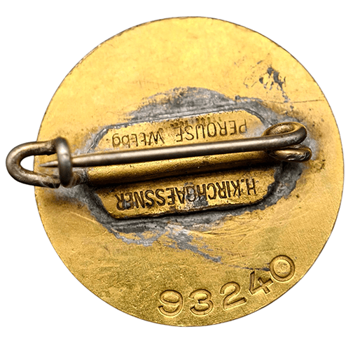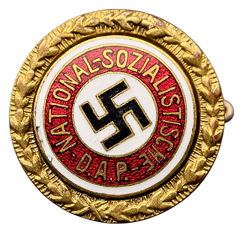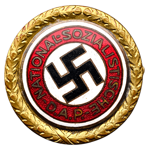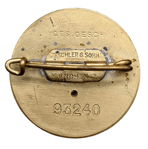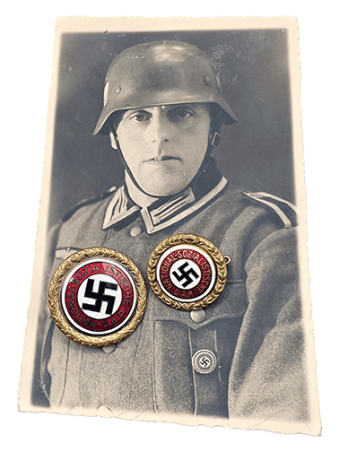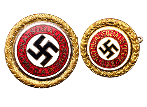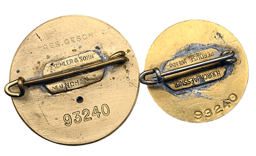 An incredible pair of gold Nazi party badges, both numbered to the same party member. The badges display a gold laurel wreath hollow brass base, backing the original design party pin with the ‘NATIONALSOZIALISTISCHE D.A.P.’ appearing under the clear red enamel, along with a mobile swastika on a white enameled background. They both show the number ‘93240’ which was the party number for one Carl Orschiedt. The larger badge is 30.5 mm dia., made by ‘DESCHLER & SOHN MUNCHEN’, the only maker of this large version of the Party Badge in Gold, the common German phrase ‘GES. GESCH’, appears on the back of the base along with the party member’s number, also present is vent hole used for the manufacturing process. The second badge is the smaller 25 mm dia. version, also marked with the matching party member’s number, with the reverse showing a period replacement pin and plate (as is very often seen with these badges), this one having the maker’s mark of ‘H. KIRCHGAESSNER’ ‘PEROUSE Wttbg.’ Solder marks from the original ‘Fuess’ round pin plate can still be seen on the badge, this badge being undoubtedly made by Joseph Fuess, the only such maker of this size Party Badge in Gold, and evidenced by the trademark fine line ridges visible behind the laurel wreath pattern, as well as the open space of white enamel between the swastika and the surrounding metal border. Both are lightly tarnished on the reverse, otherwise very good. With a photo postcard of Orschiedt wearing the Party Badge in Gold.