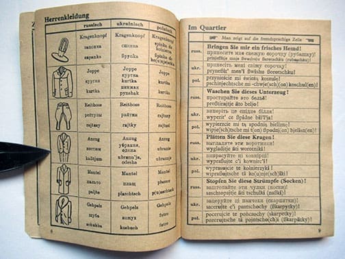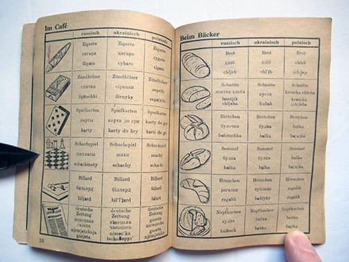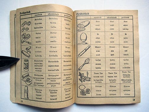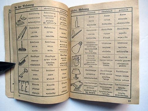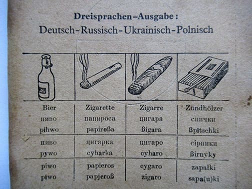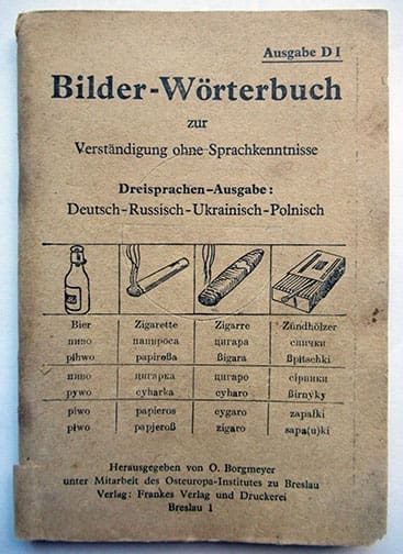 The 4 x 6 inch, 96-page soft cover book was published in 1943 by Borgmeier Verlag in Breslau, Prussia. It must have been a helpful tool for the German soldier to communicate with the population in the conquered territories in the east. The book lists all kinds of everyday items as well as services with an illustration, next to it the German word or phrase and in the same row the translation into Russian, Ukrainian and Polish.
