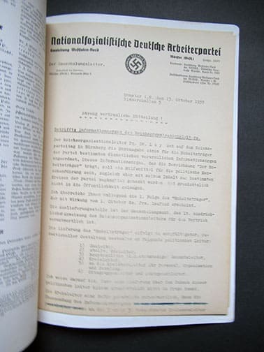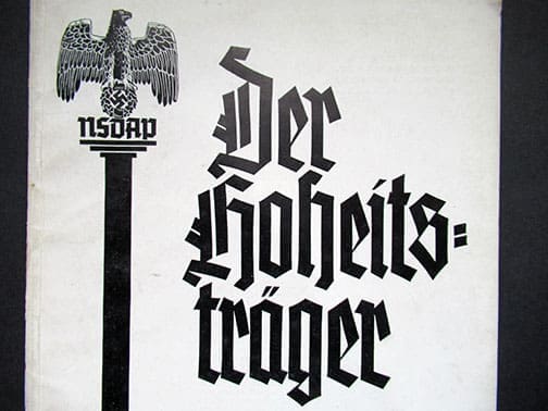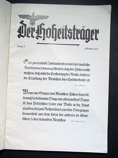 The ‘Der Hoheitsträger’ (The Sovereign) was the official information organ of the Reichsorganisationsleiter of the NSDAP for functionaries of the party and its organs, called ‘Politische Leiter’ (Political Leaders). In addition, it was the proclamation sheet for the Main Staff Office, the Main Organization Office, the Main Personnel Office and the Main Education Office of the NSDAP. The monthly publication was strictly confidential, never for public sale, each copy was numbered and was supposed to be kept under lock and key, and it was illegal to pass copies on to third parties. The editions contained the following instructions: ‘To be used by the recipient and reader only confidentially for service in motion. Any other use, as well as the intentional or negligent disclosure of the content to other persons, will be prosecuted in a disciplinary and criminal manner.’
