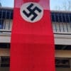 100% original, unique 114 x 46 inches double sided cotton banner. This one was period modified with beautiful gold tassels added to bottom that are complete. The textbook original white reinforced top had hanging ropes cut (see photo) and seven 3×3 inch matching cloth loops added. This flag was used and has stains (possibly blood?) with a few tiny holes. The main red body is bright with painted black swastika mirror image on white cloth body that is just over 2 feet.