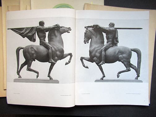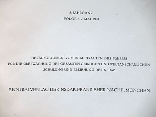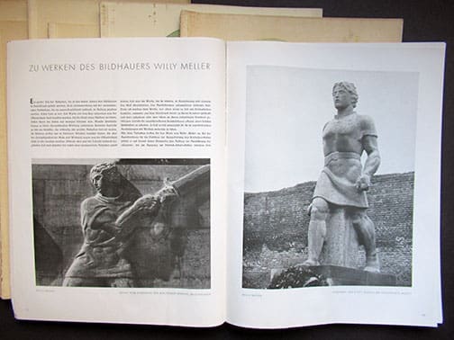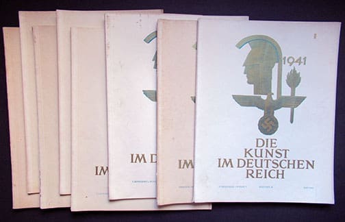 Die Kunst im Deutschen Reich (The Art of the German Empire), before September 1939 titled Die Kunst im Dritten Reich (The Art of the Third Reich) was a state-published art magazine in Nazi Germany, and the country’s biggest art publication. It began publication in January 1937 and was published monthly until July 1944; occasionally in double issues. The magazine was very strict and selective in what it featured, and extremely few of its artists were women. Exhibits at the Grosse Deutsche Kunstaustellung (Great German Art Exhibition) amounted for approximately one third of the magazine’s illustrations. In 1939, its circulation was 50,000 copies. These monthly periodicals were published by Central Publishing House of the NSDAP to educate the German people about Third Reich art and architecture. Die Kunst im Dritten (Deutschen) Reich was published in two editions, Ausgabe A and Ausgabe B, which contained a longer chapter on architecture. Prof. Albert Speer and Dr. Ing Fritz Todt (until his death in 1942) were mainly responsible for the content of these excellent periodicals, also one of Hitler’s other favorite architects, Gerdy Troost. The size of these amazing periodicals on high quality paper (even during war times Speer did not go cheap) is 11 x 14 inches and each issue contains great photo material, a lot of it full page photos and some even in full color.