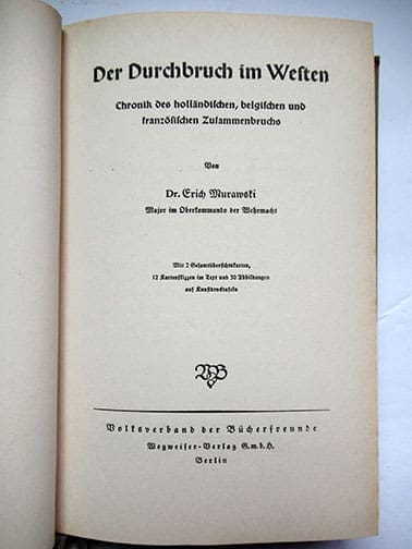 This excellent 5-1/4 x 8-1/4 inch, 340-page hardcover book in very nice condition by OKH Major Murawski was published in 1940 by Stalling Verlag in Berlin. The book has many photographs and is a great summary of the Blitzkrieg against Holland, Belgium and France and the defeat of the British Expeditionary Forces at Dunkirk.
