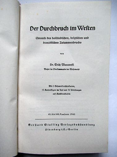 This excellent 5-1/4 x 8-1/4 inch, 340-page hardcover book in very nice condition by OKH Major Murawski was published in 1940 by Stalling Verlag in Berlin. The book has many photographs and is a great summary of the Blitzkrieg against Holland, Belgium and France and the defeat of the British Expeditionary Forces at Dunkirk.