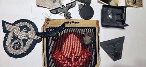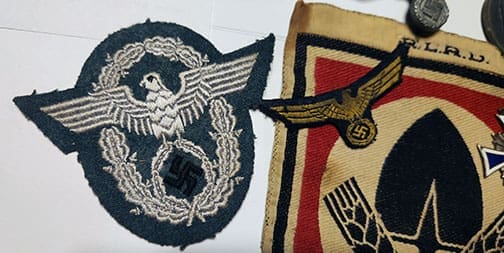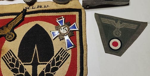 Nice variety a bring backs we just purchased, a cloth navel cap eagle removed, a large RAD sports shirt insignia removed, police arm eagle removed, silver mother’s cross with damage, frozen meat medal (1941 Winterschlacht im Osten) without ribbon, metal political visor cap eagle RZM M1/56 removed, mint Heer M43 cap insignia, well used aluminum Luftwaffe buckle complete but two prongs are missing on back to hold to main body, and 4 photos. Bargain priced!