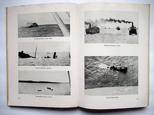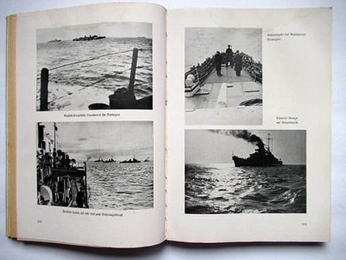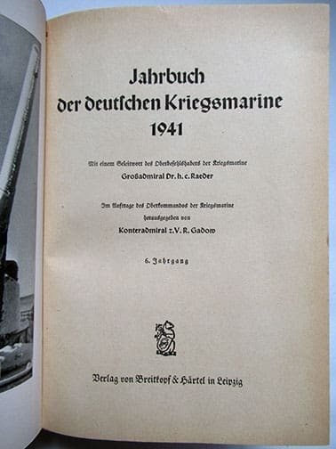 The 7 x 9-1/2 inch, 186-page hardcover books was published by order of the Oberkommando der Kriegsmarine (High Command of the Navy) by Verlag Breitkopf and Haertel in Leipzig. The yearbook series (there was one volume per year for Heer, Luftwaffe and Kriegsmarine) was started in 1937, each book contains a ton of information pertaining the German Naval Forces, new battleships, strategies, war photographs (in the 1939 and onward editions) and much more. The Foreword is written by the Oberbefehlshaber der Kriegsmarine (Commander of the Navy), Generaladmiral Dr. h.c. Raeder.
