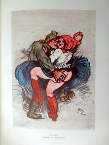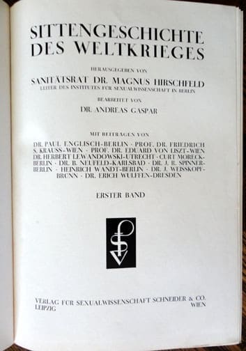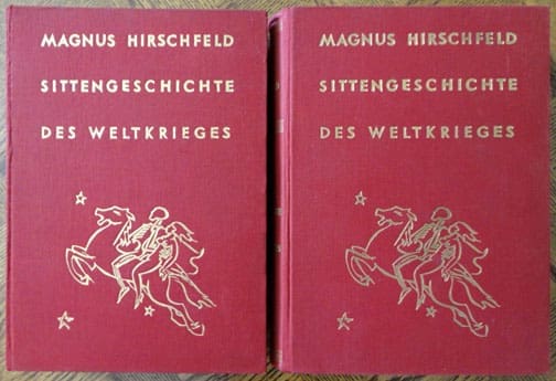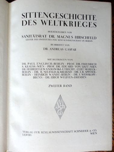 The two 7 x 9-1/2 inch, 450 and 420 page hardcover books by Sanitätsrat Dr. Magnus Hirschfeld, Head of the Institute for Sexual Science in Berlin were published in 1930 by Verlag für Sexualwissenschaft in Leipzig. The book set is probably the most comprehensive work about erotic and sex in World War One! The books contain hundreds of illustrations as well as very interesting chapters about everything about this subject, including chapters about female spies who worked in brothels, venereal diseases, “trench erotic”, erotic in field hospitals, female soldiers in WWI, war brothels, homosexuality in war times and much more. It even says how much the brothel charged for the ‘service’ (see one of the pictures): “Payable For Intercourse are: “In The Brothel For Enlisted Men 2 Mark (or 2.50 Francs) To The Prostitute and 1 Mark To The Lady Who Owns The Brothel – In The Brothel For Officers 4 Mark To The Prostitute and 2 Mark To The Lady Who Owns The Brothel”. Both books are in very good condition.