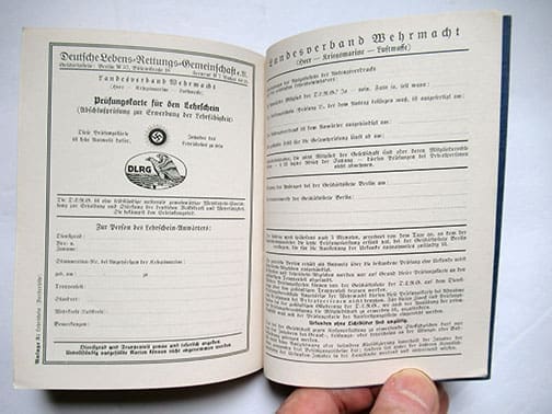 The 4-1/2 x 6 inch, 72-page soft cover book was published in 1938 by the Marinesportschule Flensburg and is a nicely illustrated training guide for future rescue swimmers within the German Kriegsmarine. Very nice condition.