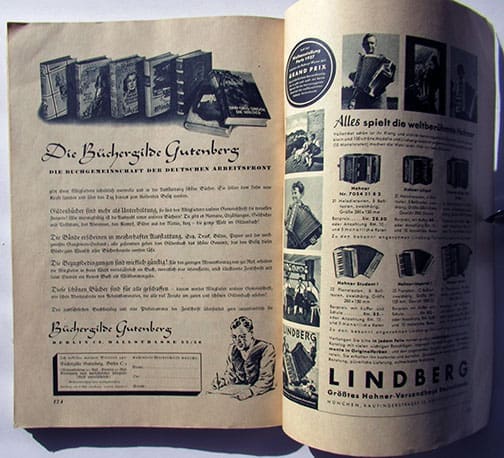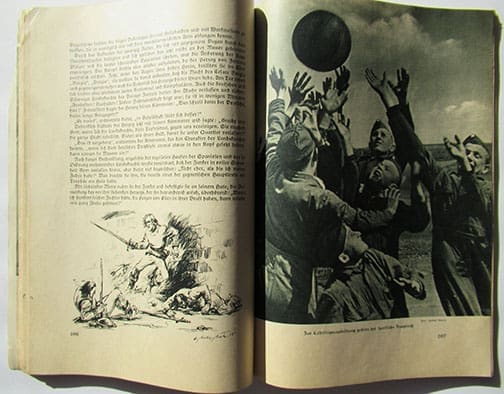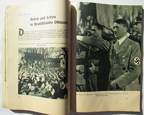 The 7 x 10 inch, 176-page soft cover book in very nice condition was published in 1938 by the Deutsche Arbeitsfront (DAF or German Labor Front) and summarizes the achievements of the German workforce und Adolf Hitler’s leadership, including cruises with the KDF fleet, new housing settlements for workers, Reichsautobahn and much more. Very interesting articles and some great advertisements.