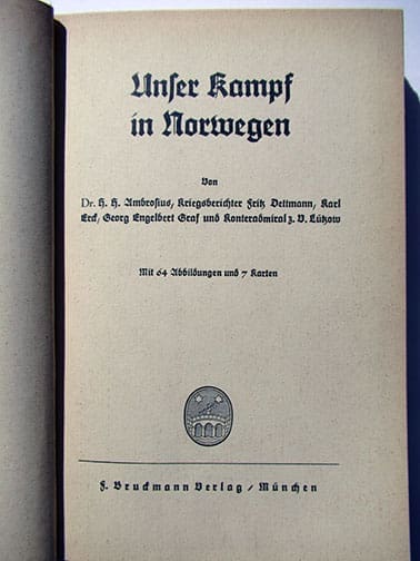 This very nice 6 x 9 inch, 224-page hardcover book with original dust jacket was published in 1940 by Verlag Bruckmann in Munich. It contains 64 photographs and 7 maps and deals about the war in Norway which resulted in German victory. An interesting book in very nice condition.