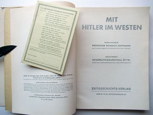 This excellent 7-1/4 x 10 inch soft cover book in good condition (only the original dust jacket shows signs of wear) was published in 1940 by Zeitgeschichte Verlag in Berlin. The professional photographs were taken by Heinrich Hoffmann, the official photographer of the NSDAP. The book is about the Blitzkrieg against France and the defeat of the British Expeditionary Forces at Dunkirk. Comes with an original order card for other H. Hoffmann books from the Adolf Hitler series.