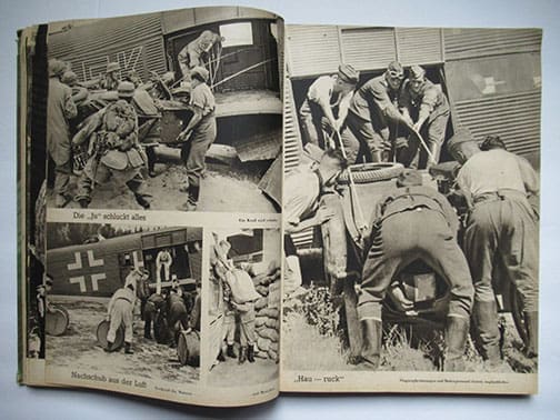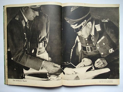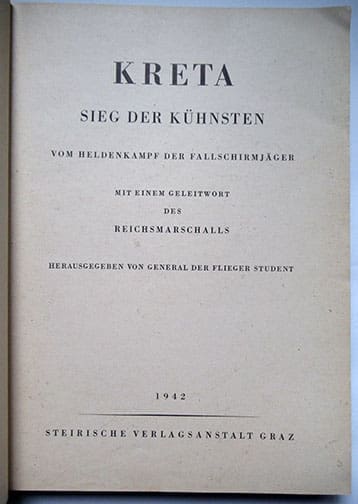 This sought after 9 x 12-1/4 inch hardcover book has about 250 pages with about 200 photographs shot by German war correspondents. It was published in 1942 by LW General Student, right after the German victory over the British forces on the island Crete, an island between Europe and North Africa. Many of the photos are huge full-page photos and some are even double page photos! The book was intended to honor the brave men who jumped out of their planes right into the British defense lines and cleared the way for the regular Wehrmacht troops and mountain troops. Many of the German Fallschirmjäger lost their lives, most of them are buried on the German war cemetery of Maleme, the little town on Crete where the German paratroopers attacked first in 1941.