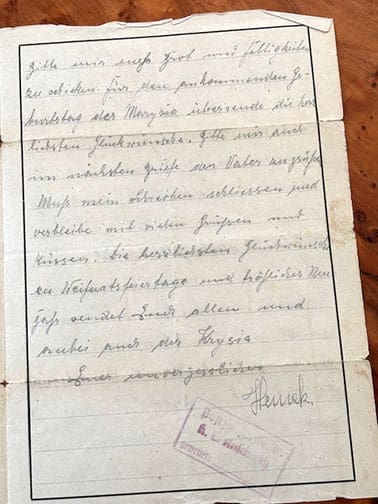 This letter, written on the official KL form, dated 21 November 1943 originated in Auschwitz concentration camp and was sent by inmate # 146129 Heinrich Wojciechowski to his parents in which he thanks them for the parcel that they sent to him. We don’t know if he survived and don’t have any information on him. A rare historical document.