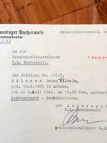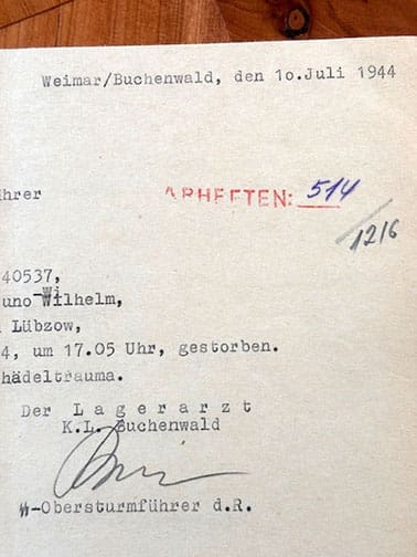The document, dated 10 July 1944 originated in Buchenwald concentration camp and announces the death of inmate #40537 who supposedly died of head trauma a day earlier (probably beaten to death by the guards). The document is signed by a SS-Obersturmführer in representation of the camp physician.