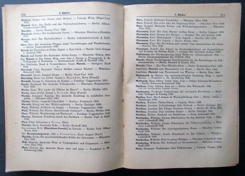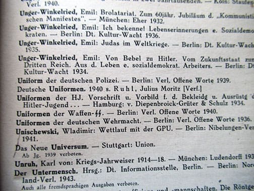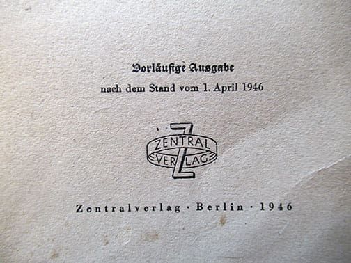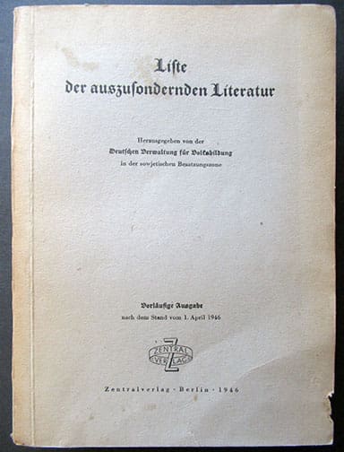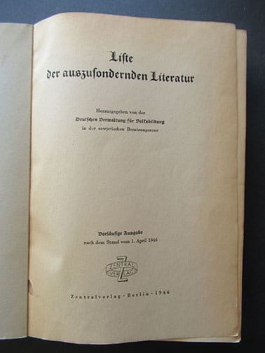 The 6 x 8-1/4 inch, 525-page soft cover book was published in 1946 by the German authorities in the Soviet occupied part of Germany (Sowjetische Besatzungszone) and contain EVERY Nazi book, newspaper, magazine, etc. that was published in Hitler-Germany that was to be discarded. Published by Zentralverlag (not to be mistaken with the NSDAP owned publishing house) in Berlin. A very interesting historic artifact in very nice condition.