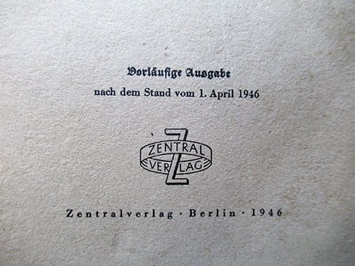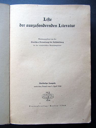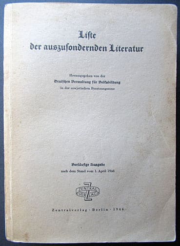 The 6 x 8-1/4 inch, 525-page soft cover bookwas published in 1946 by the German authorities in the Soviet occupied part of Germany (Sowjetische Besatzungszone) and contain EVERY Nazi book, newspaper, magazine, etc. that was published in Hitler-Germany that was to be discarded. Published by Zentralverlag (not to be mistaken with the NSDAP owned publishing house) in Berlin. A very interesting historic artifact in very nice condition.