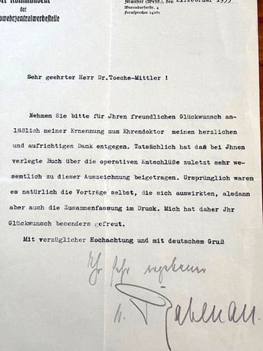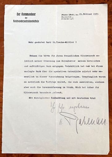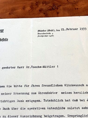 The letter dated 21 February 1935 is addressed to a Dr. Toeche-Mittler whom he thanks for congratulating him for his honorary doctorate and how helpful his lectures and publications were for him. Signed with a strong signature.