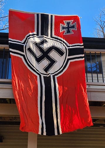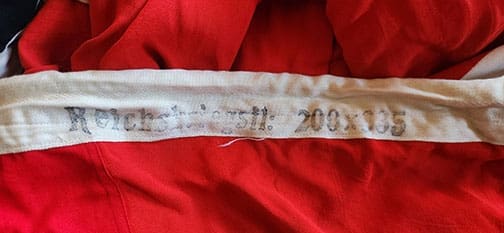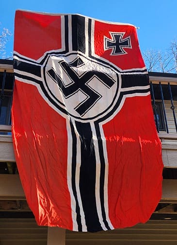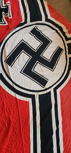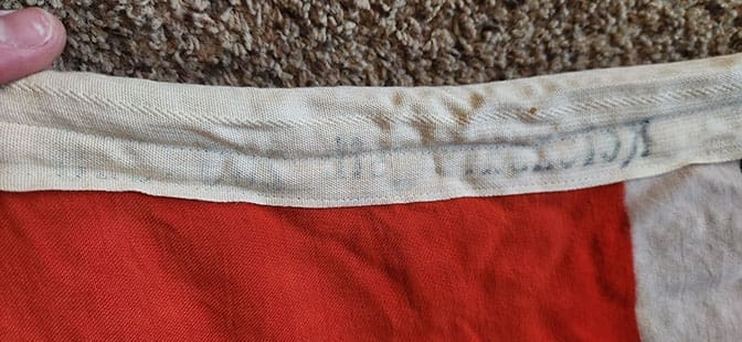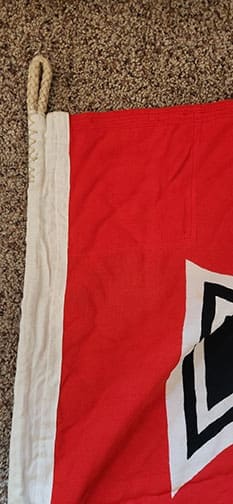 This is one of 3 original flags that we just bought, after they were discovered in the GI backpack by the family. This 2000 x 3350mm / 78 x 132 inches Kriegsmarine battle flag has light wear with NO damage or problems. Some markings are legible; the others are quite faded. The rope was cut but about 4 inches remaining.