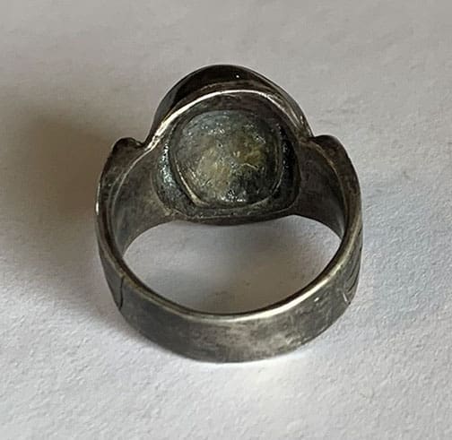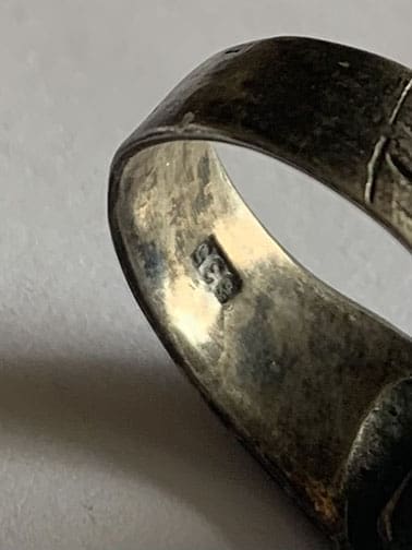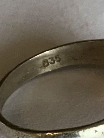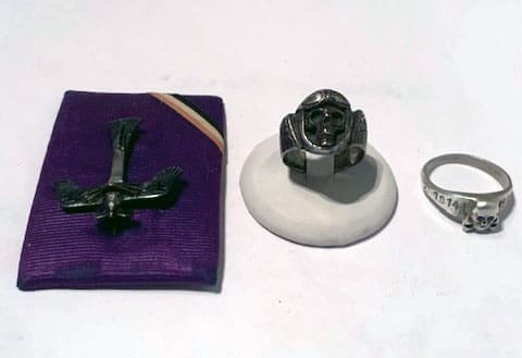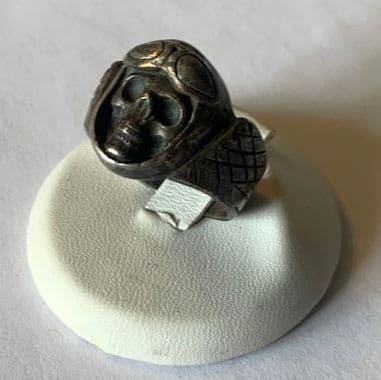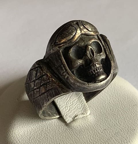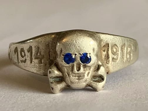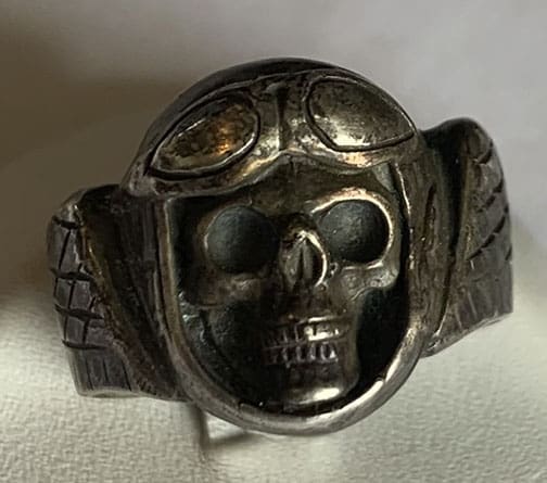 This is a direct veteran bring back grouping once belonging to Hermann Göring. A USA veteran stationed in Germany 1945-1946 retrieved these items from what was Hermann Göring’s house in the Obersalzberg area near Berchtesgaden. Herman Göring had many items evacuated from his Carinhall hunting lodge in northern Germany to Berchtesgaden as the war came to an end. At wars end many items fell into the hands of veterans and locals. This grouping consists of items belonging to Hermann Göring from his WWI time as a fighter pilot. The grouping consists of two silver rings and a silver award piece. The first ring is a large solid ring of 835 silver and marked accordingly on the inside of the band. Its design is that of a totenkopf skull with a pilots leather helmet and goggles. Beautiful patina and a heavy substantial piece. Approximate size US 9. The second ring is also a Totenkopf skull in 835 silver and marked according on the inside of the band. It has two blue gemstones set as eyes. Interesting in that people always remarked that Hermann Goring had piercing blue eyes. Band is marked 1914-1916 for WWI service time. Ring is approximate size US 9.5 The third item in the grouping is a beautiful silver piece representing an early German aircraft on its original presentation placket. High quality silver with a beautiful patina. This is an evocative early grouping of Hermann Göring from his WWI days as a fighter pilot, bought from the veteran decades ago.