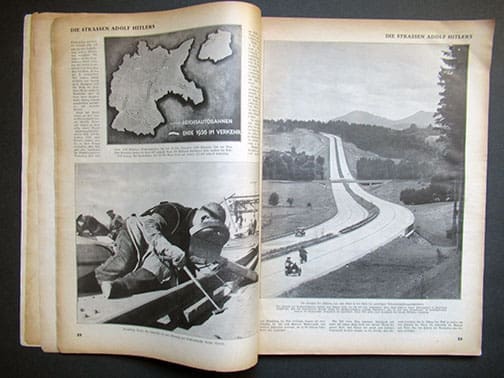 This 10-1/2 x 14-1/1 inch 128-page soft cover book is full of photos showing everything that had improved in Germany in the first four years under the leadership of Adolf Hitler! The first chapter shows the chaotic situation after World War One, high unemployment rate, Jews everywhere in high positions, no future for the youth, etc. – The following chapters deal with the uprising of the economy, thanks to the new special employment and construction programs like the Reichsautobahn, the construction of homes for workers and farmers, etc. – the new created Third Reich mass organizations like the Reichsarbeitsdienst, the NSKK, the Wehrmacht, etc. are explained and everything is heavily illustrated with photos on every page, many of them huge full page and even double page photos.