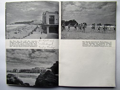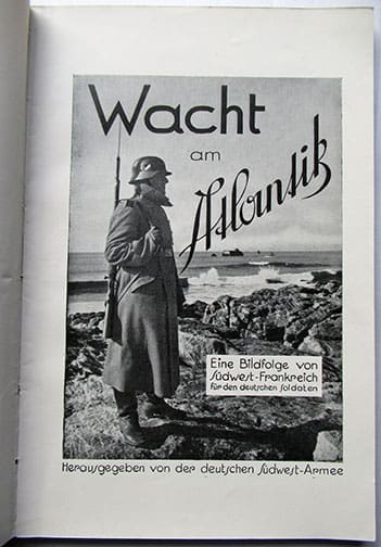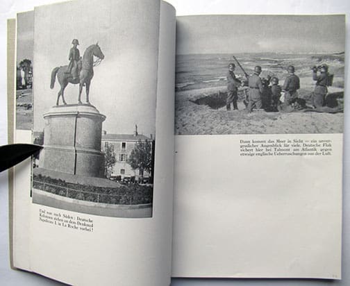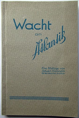 These 6 x 9-1/2 inch, 96-page heavily illustrated soft cover book was published by the German armed forces that were occupying the southwest of France and printed in 1940 in Bordeaux, France. It was meant to be a remembrance book for the German soldiers who were stationed at the Atlantic coast in southern France. A seldom seen find in excellent condition.