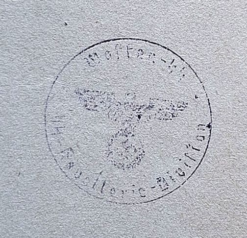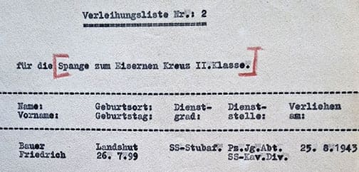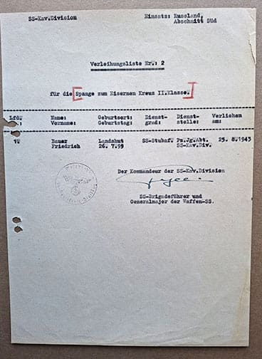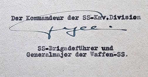 The document originated at the Russian front (Abschnitt Süd) and lists a SS-Stubaf. of the Pz.Jg.Abt. of the SS-Kavallerie-Division of which Fegelein was the commander as the recipient of the clasp of the Iron Cross 2nd class. The document bears Fegelein’s bold ink signature. Hermann Fegelein was Heinrich Himmler’s liaison officer in Hitler’s headquarters and therefore a member of his entourage. He also was Hitler’s brother-in-law through his marriage with Eva Braun’s sister Gretl. Fegelein deserted his post in the Führerbunker in the last days of the battle of Berlin, was captured by the Reichssicherheitsdienst (RSD) and was shot for desertion on 28 April 1945.
