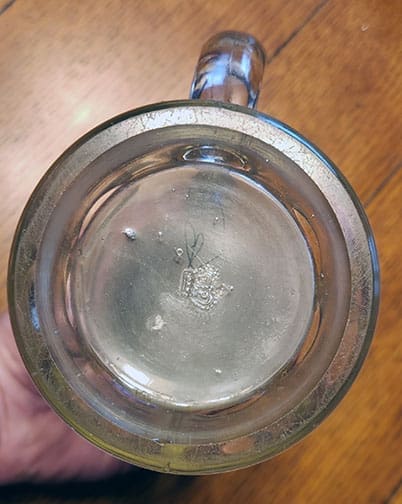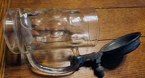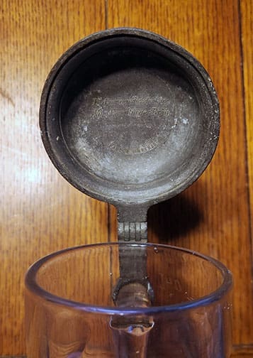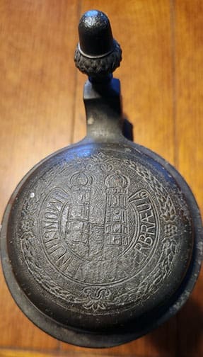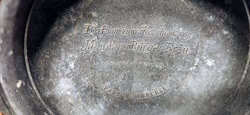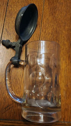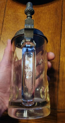 Nice well used 0.4 heavy glass beer mug from a historic location. We priced it according to condition but its fully functional and 100% original. Very well marked on bottom with crown and inside lid. We recently purchased a longtime collection of mugs from a German collector. These are not common.