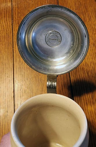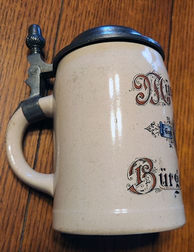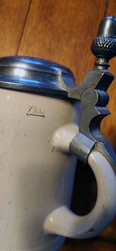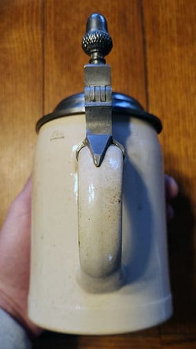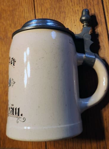 Very nice mug for its age. Has normal wear but no damage or flaws. Its 1/2 L and is fully functional. Bottom is marked and under lid nicely marked. You will not be disappointed. It is a nice solid mug from a historic location. We recently purchased a longtime collection of mugs from a German collector. These are not common.