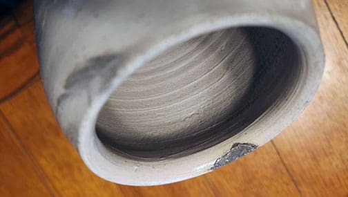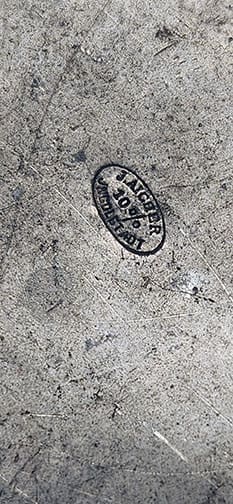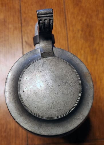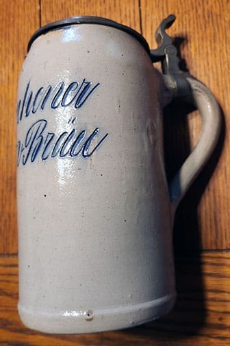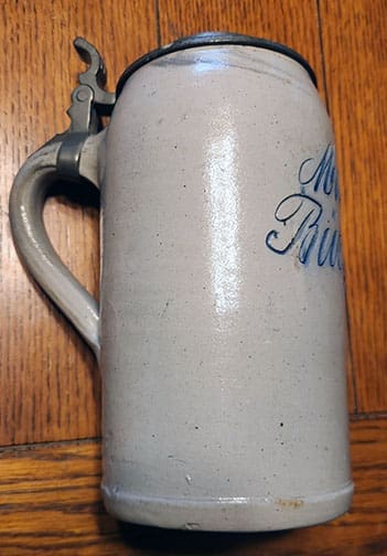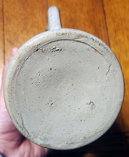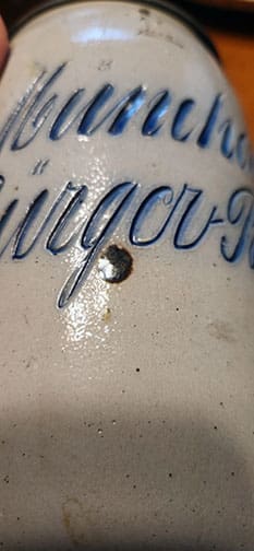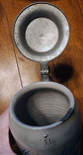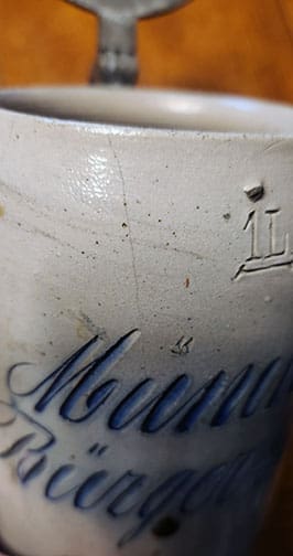 Nice heavy one liter mug with much character and with that 100-year-old look. This one had flaws already when constructed and then glazed over. Has a couple lines or flaws but doesn’t transfer to the inside so we don’t consider that a hairline crack. Has normal wear and aging and priced accordingly. We recently purchased a longtime collection of mugs from a German collector. These are not common.