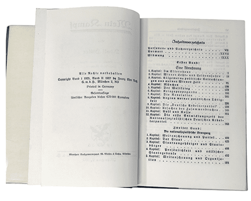 Hitler dictated this book to his secretary, Rudolf Hess while imprisoned in Landsberg after the failed 1923 revolution. The first editions (1925 and 1926) were only “Band I” (volume one). “Band II” (volume two) was first published in December 1926. All the “official” Third Reich copies (1933 to 1945) contained both volumes combined in one book. Very few copies of the first editions have survived. When his book first came out it was not a success, few people cared about the book in 1925 which would almost have had a much longer title. The original title Hitler chose was “Viereinhalb Jahre [des Kampfes] gegen Lüge, Dummheit und Feigheit” (Four and a Half Years [of Struggle] against Lies, Stupidity and Cowardice). His Nazi publisher, Max Amann, decided this title was too complicated and had it shortened to Mein Kampf (simply “My Struggle”). Before Hitler became Reich Chancellor of Germany in 1933, Mein Kampf sold very slowly; but in 1933 alone 1.5 million copies were sold.
