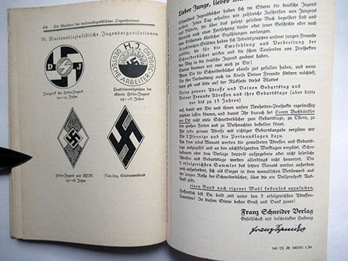 Offered for sale is a very interesting 5-1/4 x 7-1/2 inch, 80- page hardcover book for German children on Adolf Hitler’s life and his career. The book contains nice illustrations; it was written by H. Morgenroth and M. Schmidt and published in 1933 by the Franz Schneider Verlag in Leipzig. A very interesting book in very good condition.