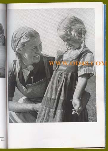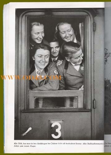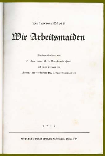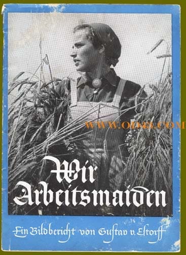 This 7-3/4 x 10-1/2 inch, 64-page soft cover book comes with its original, often missing, undamaged dust jacket, it has excellent photos on every page, many of them full page photos giving nice close-up views of the Arbeitsmaiden work uniforms, clothes and Reichsarbeitsdienst badges. This wonderful book gives a very nice overview of the mandatory female Labor Service in the Third Reich. It was written by Gustav von Estorff and published in 1940 by Zeitgeschichte Verlag in Berlin.