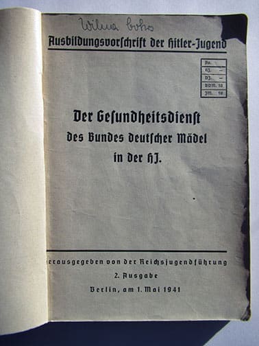 This 6 x 8-1/4 inch, 178-page soft cover book was published by the Reich Youth Leadership and deals about health, first aid, etc. in the BDM. Very interesting material.