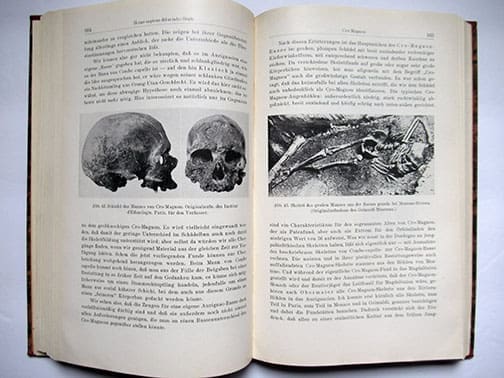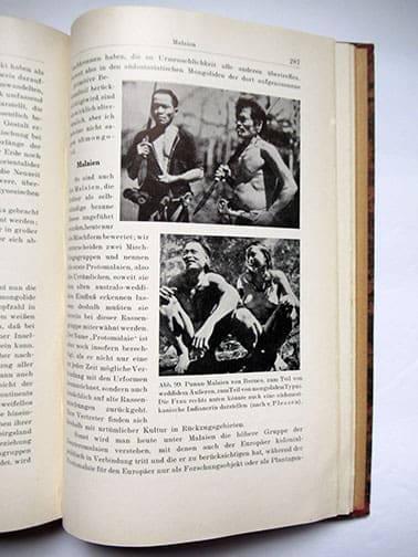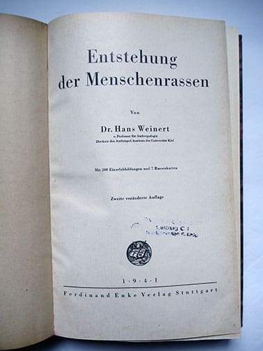 The 6-1/4 x 9-3/4 inch, 324-page hardcover book with 200+ pictures by Dr. Hans Weinert was published in 1941 by Ferdinand Enke Verlag in Stuttgart and is in very nice condition. The book is an interesting Third Reich era study of the origins of the different human races.
