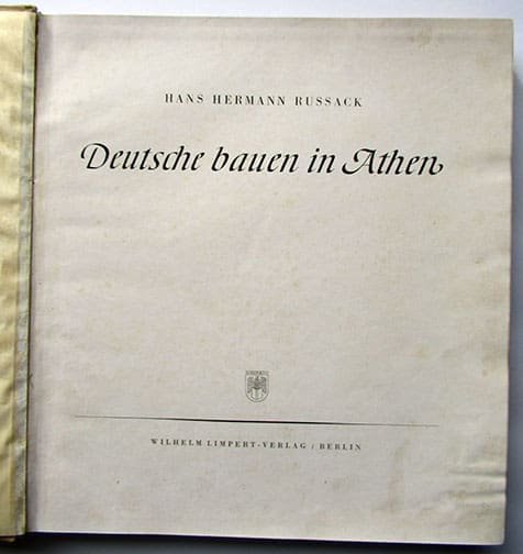 The 9-3/4 x 10-1/2 inch, 200-page hardcover book bu Hans Herrmann Russack was published in 1942 by Limpert Verlag in Berlin and is in nice condition. It deals about German architects and construction in Athens, Greece.