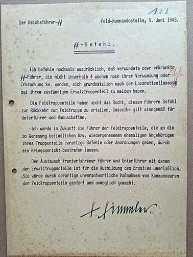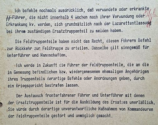 I once again specifically order that wounded or injured SS Leaders who are not after 4 weeks ‘kriegsverwendungsfähig’ (fit for duty) have to report to their Ersatztruppenteil (Replacement Troops Unit). The Feldtruppenteile (combat field troops) don’t have the authority to order them back to the fighting troops in the field. This includes all lower ranks as well. From now on the leaders of the field troops who order the return of former members of their units while still in recovery will face disciplinary action in front of a military tribunal. Replacing leaders with front experience with members of the replacement troops is essential and would be made impossible by the irresponsible actions of leaders of the fighting field troops.