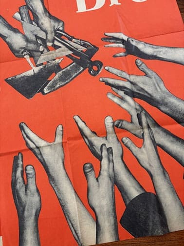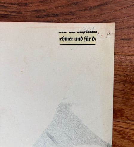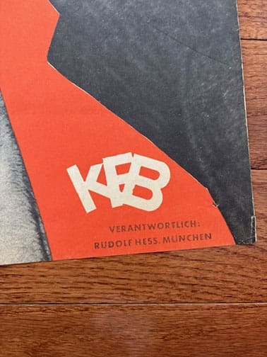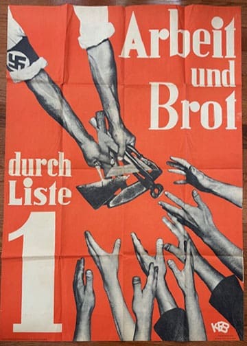Offered for sale is this 33 x 44 inches illustrated NSDAP propaganda poster designed by Rudolf Hess and printed by Buchgewerbehaus Müller where most of the German Mein Kampf copies were printed. The poster is very symbolic. Two strong arms, the sleeves rolled up – sign of getting ready to get things done – a swastika armband visible, handing down tools to the people. The tools symbolize work and work means bread on the table, and that is what the Nazi party promises on this rare poster.