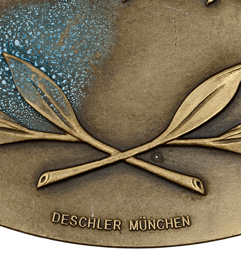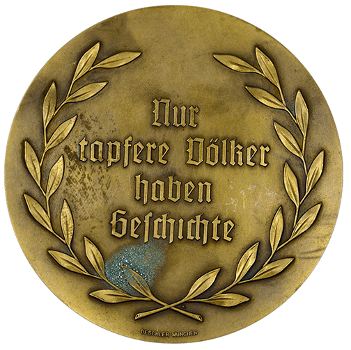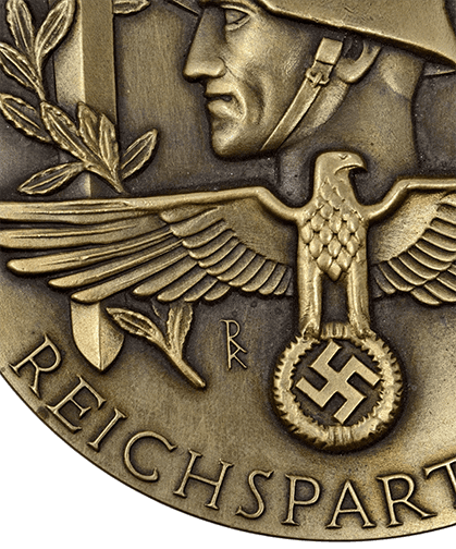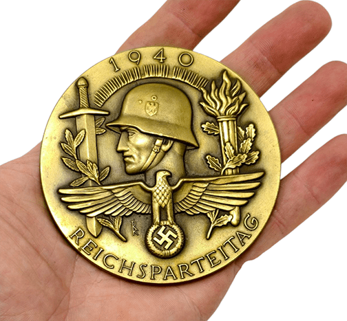 Prototype 1940 Reichsparteitag Medal. This event as well as the 1939 rally have never taken place due to the outbreak of the Second World War. The 1939 and 1940 Reichsparteitag table medals were designed and struck in anticipation of the event(s) and were put into storage in the attic of the Deschler factory in München (Munich) where they were forgotten about for decades (see photos how they were found in the 2000’s). The design is by Richard Klein and his initials RK are under the left wing of the eagle. The material is Tombak. When they were discovered several years ago, they were sold to a few select dealers inside of Germany. Very few samples were struck, and this piece is extremely rare. 3-1/4 inches in diameter. This is the bronze version. There also was a silver version.