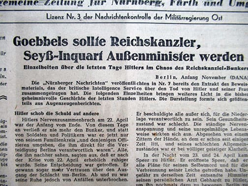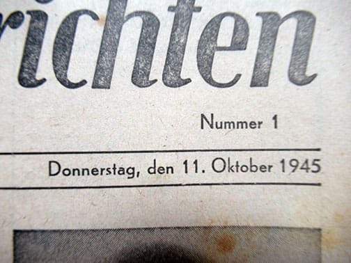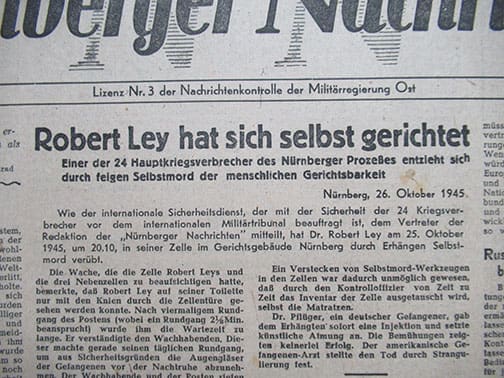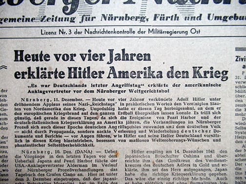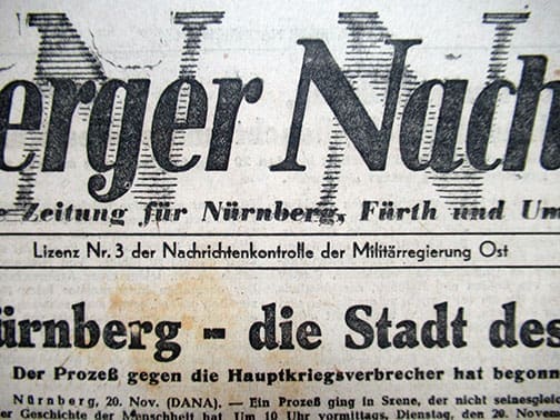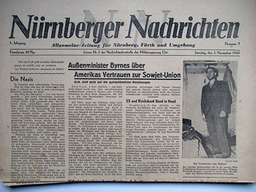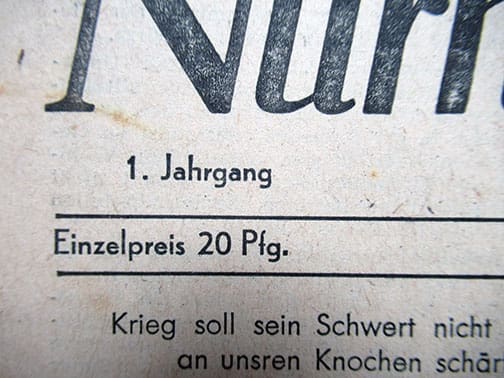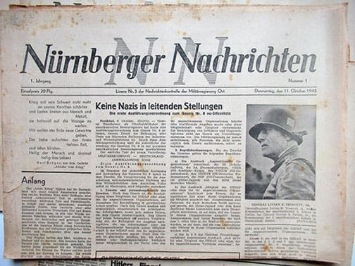 Offered here are almost all issues of the first year of publication of the postwar newspaper in Nuremberg that was authorized by the Allies to be published. Even though there are also other articles, mostly on how to get everything working again in destroyed Germany, the most focus is on the Nuremberg Trials where the main Nazis that were still alive had to answer for their crimes. Offered here are issues #1 thru #19 and #21 thru #23 from 11 October 1945 to 29 December 1945. Only issue #22 is missing. All 22 issues are complete but some show damage along the edges. Each issue contains interesting articles about the Trials, i.e. Dr. Ley’s suicide in his cell, how survivors described the last days in Hitler’s bunker in Berlin, that Göring lost some weight, what Hess was saying, etc. – very interesting very early postwar material about the Nuremberg Trials (just on time for the upcoming movie of the same title with Russell Crowe!).