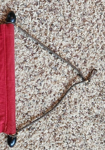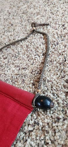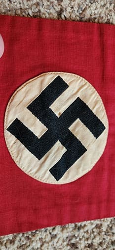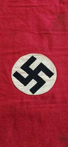 26 x 6-3/4 inches, unique double sided hanging flag with tassels. What makes this one special is that it has all it’s original wood rod, rope and clip present for hanging. The roundels on both sides are constructed like armbands and same size. Normally these are cut or removed when liberated. This one has seen action but is solid. Has stains and dirt marks and missing a few tassels on bottom. It also appears to have tinnies attached to its red body at one time because of the tiny pin holes throughout. With that all said, it is a killer display piece and ready to hang if desired.