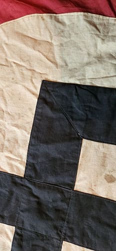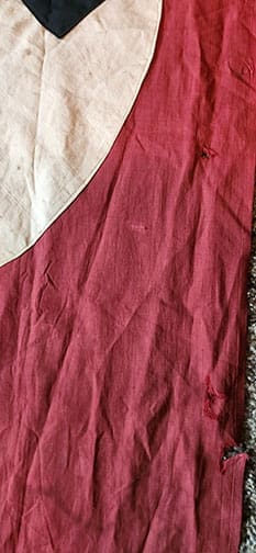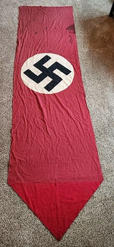 Used 113 x 30 INCH single-sided banner. If you like original items in mint condition, this one is not for you. This one has seen heavy usage and is in used bring back, unaltered condition. The front is faded, has holes, stains, and was tore down from the corner indication. It has the multiple construction swastika and a unique bottom triangle piece added during the war, which makes this banner very unique. No maker marks that we could find. If this one could talk!
