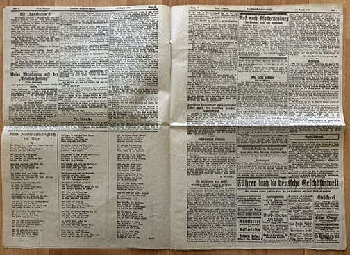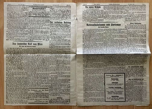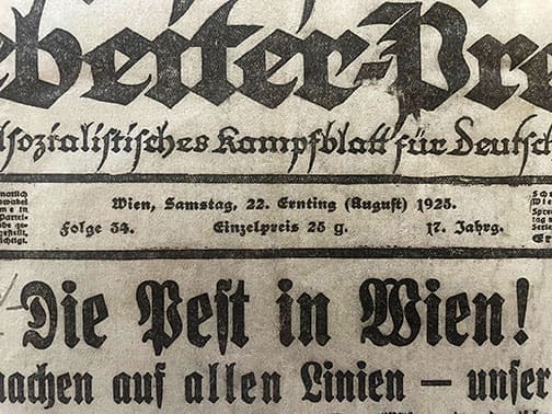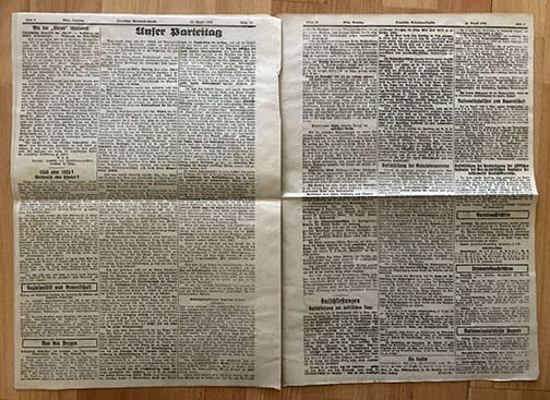 This extremely rare ‘Deutsche-Arbeiter-Presse’ was the early official publication of the NSDAP in Austria, very comparable to the “Stürmer” that Julius Streicher published in Germany. The title story of this issue from 1925(!) is entitled ‘Die Pest in Wien!’ The paper is complete and in nice condition. We have never offered an issue before and never saw one for sale anywhere either.