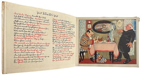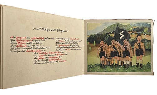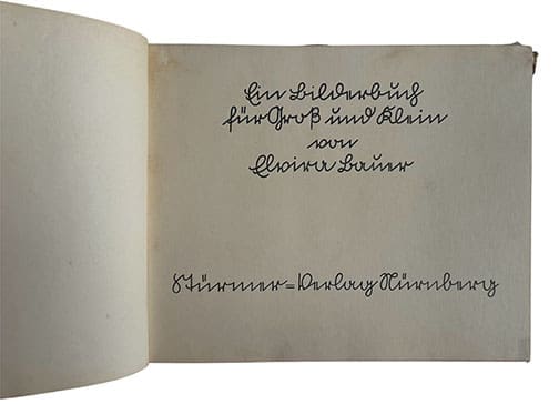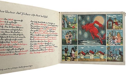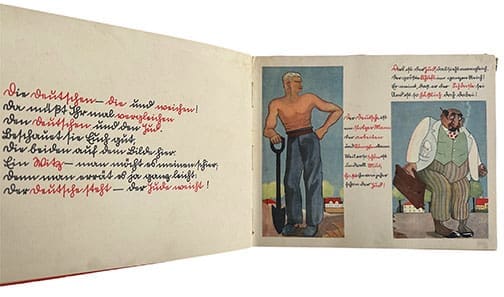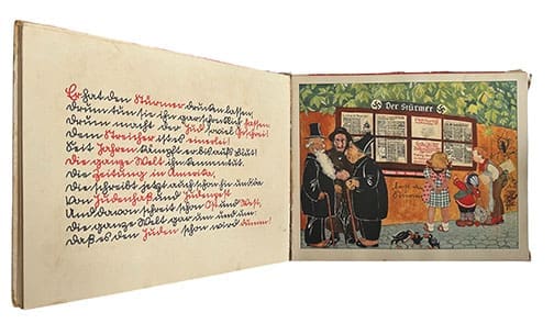 The extremely anti-Semitic text, written in Sütterlin – the old-style German handwriting, was written by Elwira Bauer, an 18-year-old art student and Kindergarten teacher, the illustrations are by Philip Rupprecht, better known as the Stürmer cartoonist FIPS.