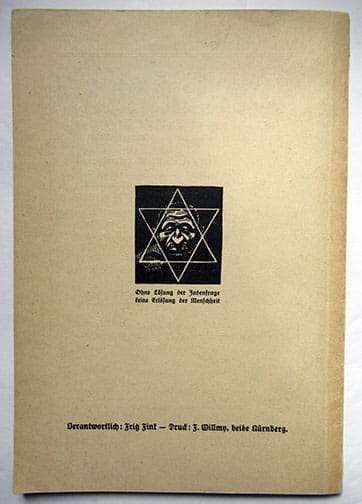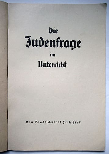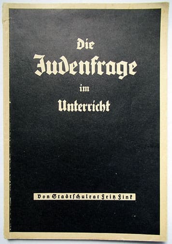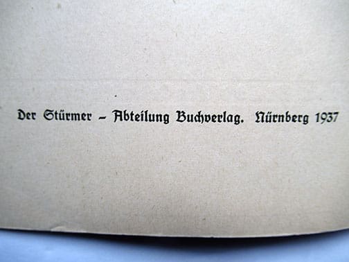 This extremely rare 6-1/4 x 9 inch soft cover book was written by Fritz Fink who was in a higher rank position in the Nazi German school system (Stadtschulrat). The book was published in 1937 by the Stürmer Publishing House in Nuremberg and was intended for schoolteachers. The goal was to urge them to incorporate as much anti-Semitism into the regular curriculum as possible. The introduction is written by Julius Streicher. He writes that the National Socialist Germany expects that the racial question is taught in German classrooms but, in order to teach it right, the teacher has to become an expert in this subject himself first. And that is the intention of this book: to teach German teachers about the racial question, so that they then can lecture about the Jewish question in the classroom! This publication was of course regarded as extremely dangerous material after the Third Reich had ended that the Allies and the post-war German government destroyed every copy they could find!