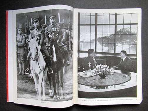 Offered here is by far one of the rarest of all books that were published by Prof. Heinrich Hoffmann! He was the Photoberichterstatter der Reichsleitung der NSDAP – (official photographer of the NSDAP Reich Leadership) and in this position also Adolf Hitler’s personal photographer. It is said that he took about two million(!) photos of the Führer. Some of the best photos he used in a series of books on Adolf Hitler that he had published shortly before and during the Third Reich. They are all 7 x 10-inch books, usually contain around 100 pages and are all heavily illustrated. It is lesser known that Hoffmann also published a number of books that were Nazi Party related but not specificly on Adolf Hitler. One of them is this photo book on Germany’s Axis Ally, Japan. The copy offered for sale in good used condition is a first edition of which only 25,000 copies were made. We are not sure if there even was a second edition of this extremely rare book. The book also contains a photo report of the Japanese attack on Pearl Harbor which the Nazis of course hailed as a tremendous Japanese victory. A great addition for every collection of historical Third Reich material and a must-have for everyone who collects Prof. Heinrich Hoffmann books.